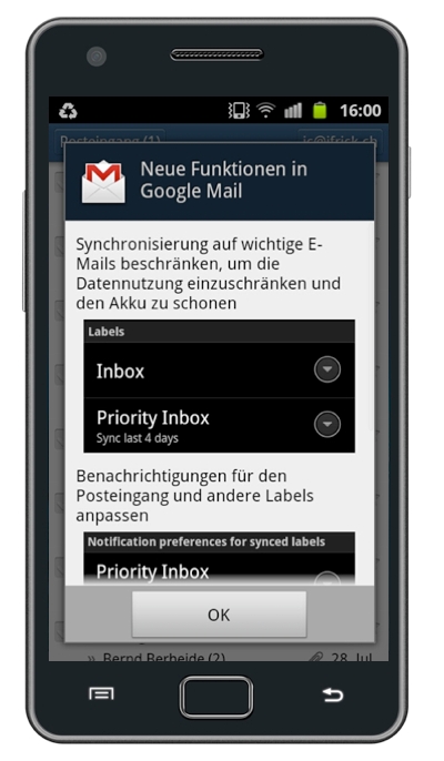 Wer den Android Market öffnet wird ein Update der Gmail App auf sein Gerät bekommen. Die neue Version 2.3.5 kann nun auch nur die Priority Inbox synchronisieren, Batterie sparen und nur für einzelne Label Notifications schicken: