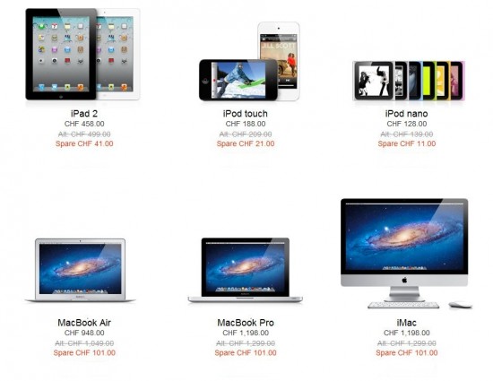Die Rabatte liegen bei ungefähr 10%, bei gewissem Zubehör auch etwas darüber. Wer also sowieso vor hatte einen iMac, ein MacBook Air, ein iPad oder einen iPod Touch zu kaufen, der sollte heute zuschlagen.