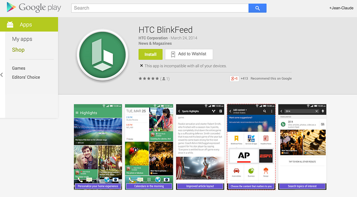 Im Play Store könnt ihr HTC BlinkFeed schon finden, es läuft aber noch auf keinem meiner zahlreichen Android Geräte. Das wird sich aber sicher noch ändern. (via HTC PR)