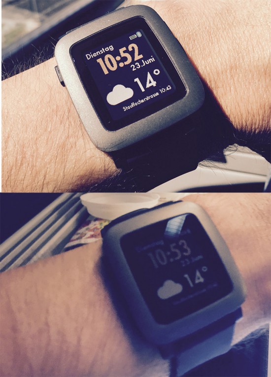 Da ich mich eher drinnen als draussen aufhalte ist das für mich ein ganz grosser Nachteil. Klar kann ich die Pebble Time bei Sonnenschein draussen viel besser ablesen als zum Beispiel die Apple Watch. Aber ich kann bei letzterer einfach mal kurz die Hand übers Display legen und dann im „Schatten“ alle bestens ablesen.