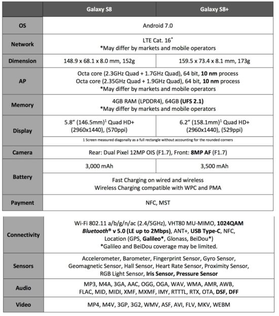 Das kleinere Modell hat einen 5,8 Zoll grossen Bildschirm während das S8 Plus einen 6,2 Zoll Screen besitzt. Beide Bildschirme lösen mit 2960×1440 Pixeln sehr hochauflösend auf. Da die Galaxy S8 Modelle etwas länger sind kommt eine etwas höhere Auflösung als QuadHD zum Einsatz.